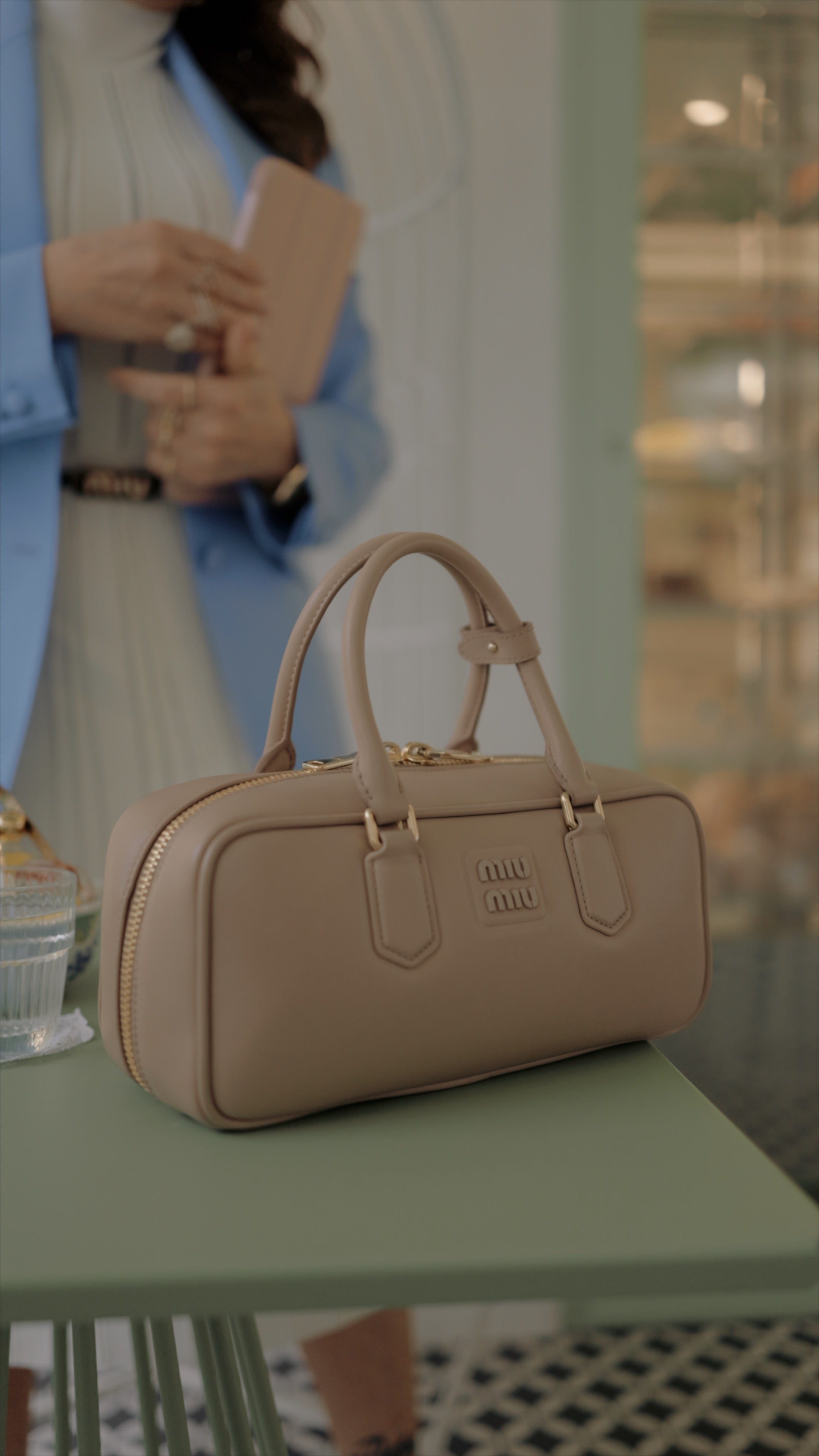 "Borsa Aventure in pelle scamosciata con finiture dorate e manico versatile per uso a mano o a spalla. Chiusura con zip per proteggere i tuoi oggetti. Interno in cotone con tasca zip e logo lettering in rilievo frontale. Dimensioni: 19x33x5 cm. #elegante #versatile #pratico"